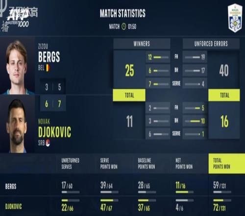 接受采访时的德约更是表现得精疲力尽。事实上,两天前那场高温下的比赛几乎已经榨干了他的体力。但老将自有老将的办法,本场比赛最后一个发球胜盘局几乎就是全场的缩影,德约极少主动得分,更多时间是不紧不慢地与贝尔赫斯对峙,等待对手自己出现失误。整场比赛,贝尔赫斯虽然轰出了25个制胜分,但非受迫性失误来到了40次,几乎是德约的3倍。于是,38岁老将靠着经验闯入四强,离连续打进上海大师赛的决赛又进了一步。